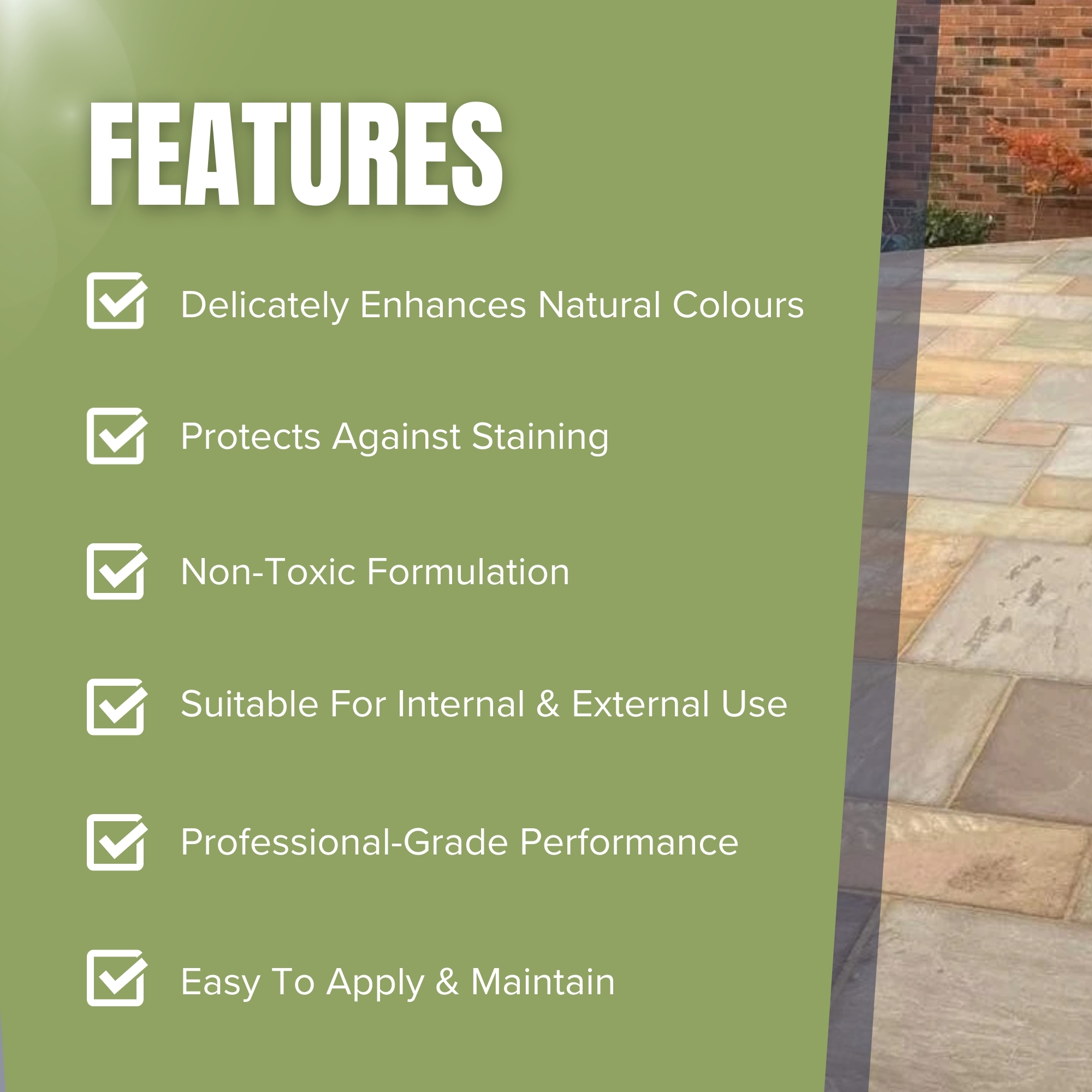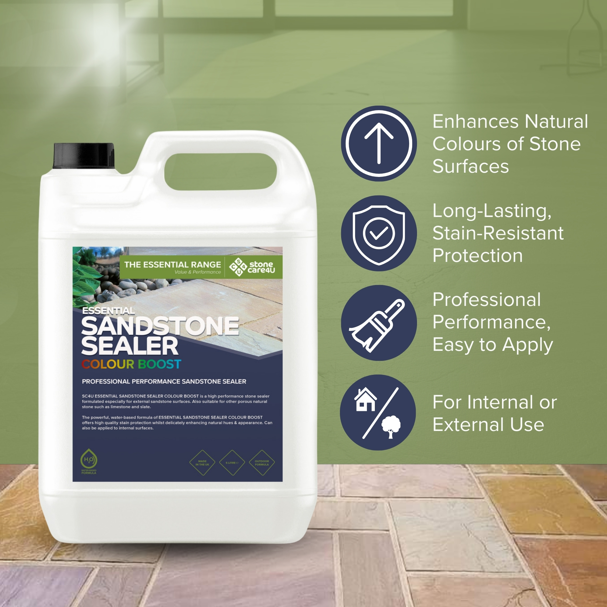 The powerful, eco-friendly formula of SANDSTONE SEALER COLOUR BOOST offers high-quality stain protection whilst delicately enhancing natural colours & appearance. Can also be applied to internal surfaces.